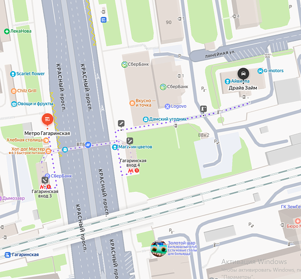 Пример маршрута: Если вы находитесь на станции «Площадь Ленина», сядьте на поезд линии 1 и проедьте 2 станции до «Гагаринской». Выйдите из метро и пройдите пешком около 450–460 метров до Красного проспекта, 88/1.
